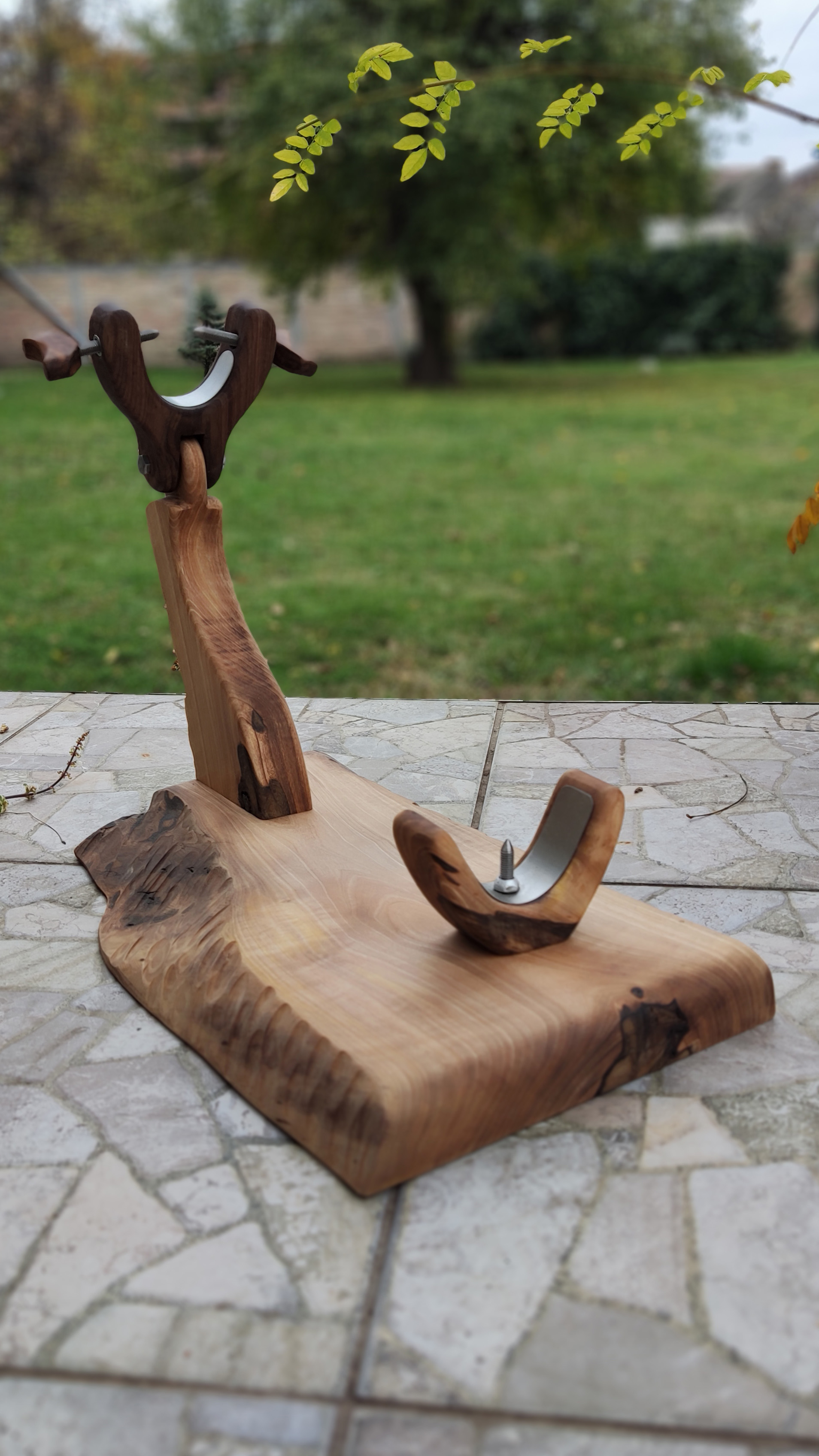 Stalak za šunku izrađen od orahovog drveta sa prohromskim detaljima.