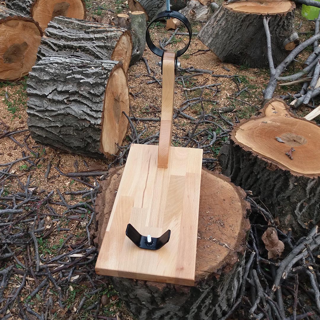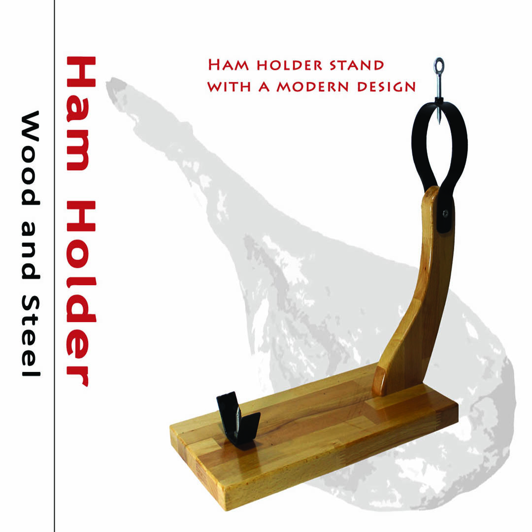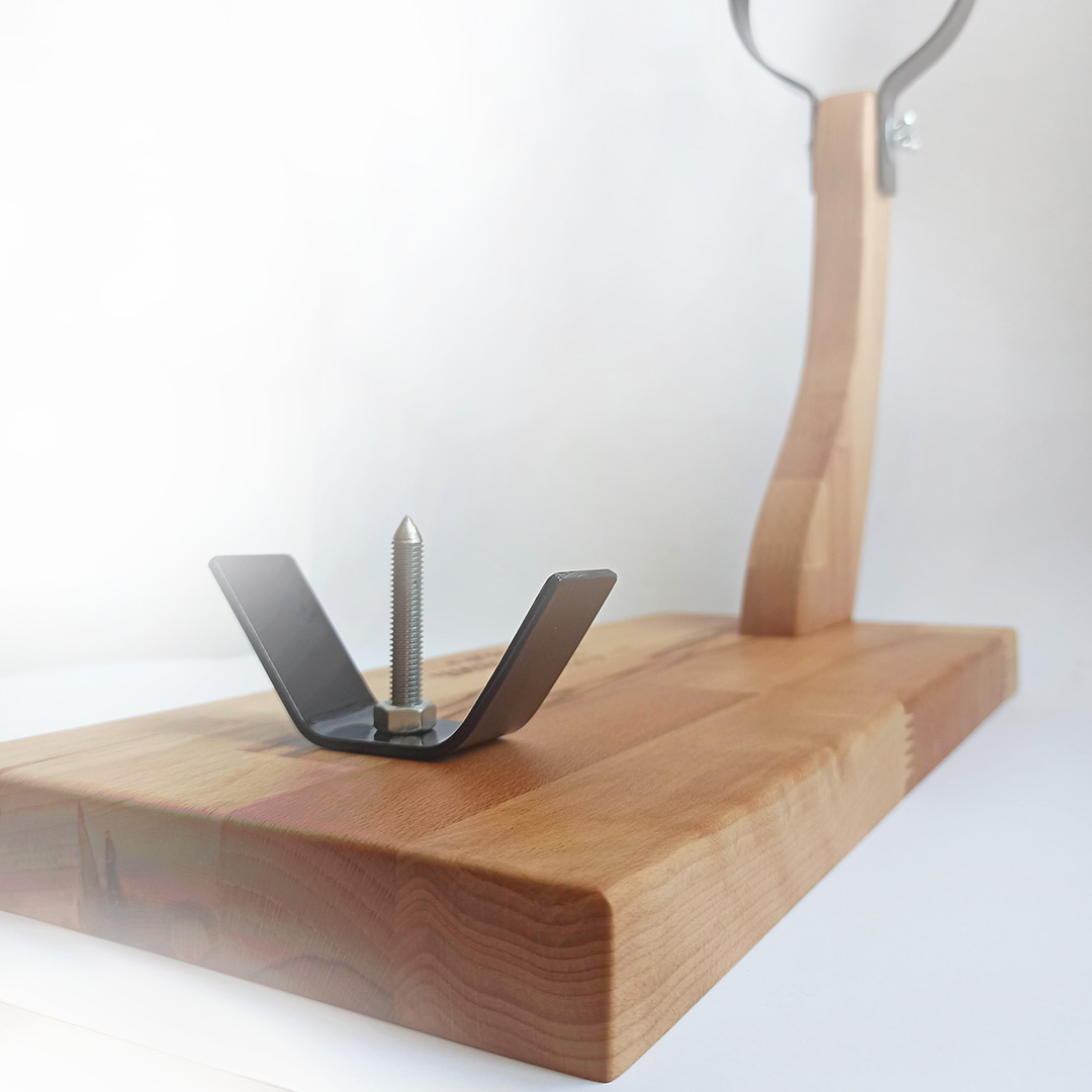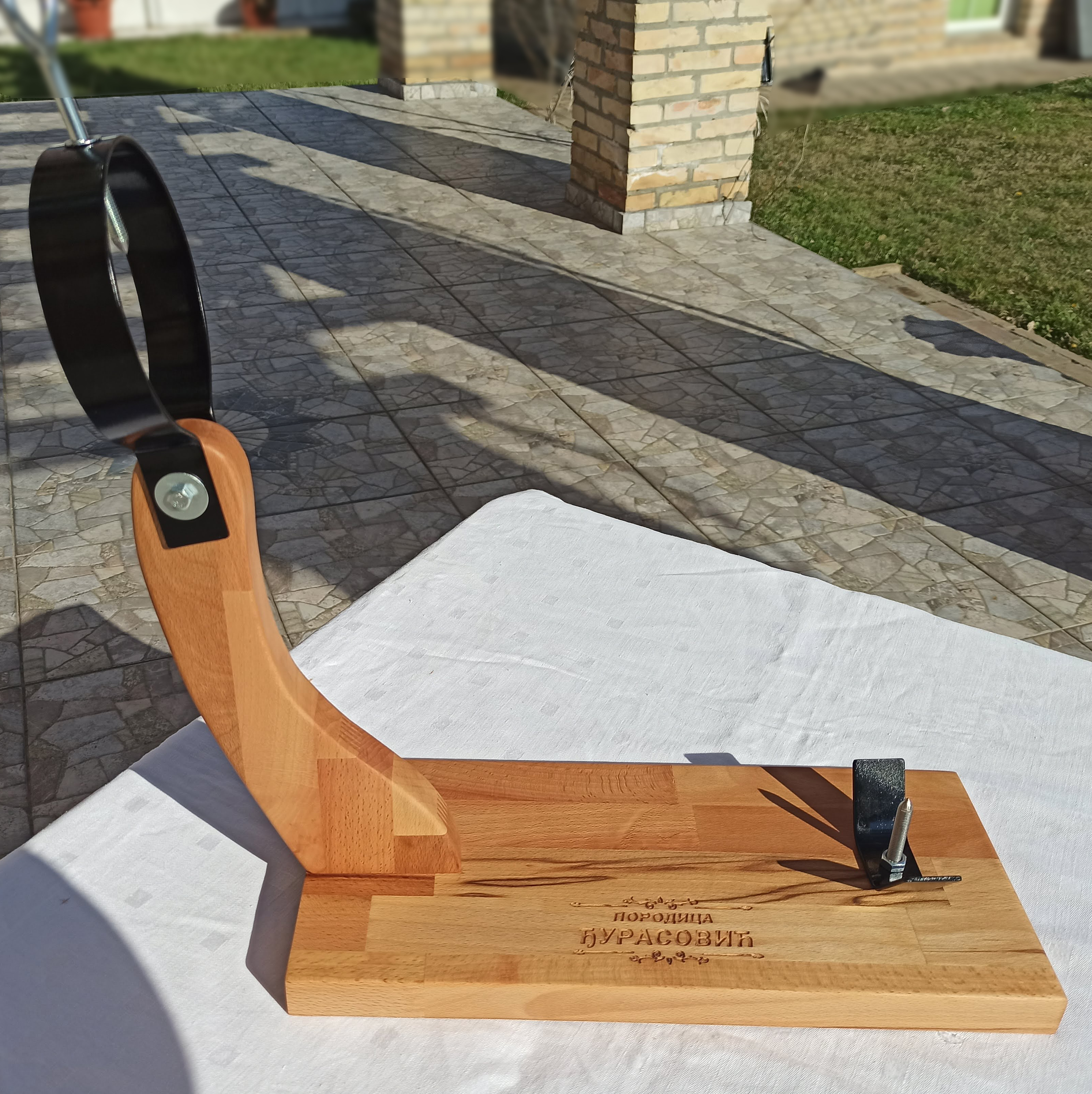 Stalak za šunku izrađen od bukovog drveta i gvozđa, sa prohromskim šiljkom.