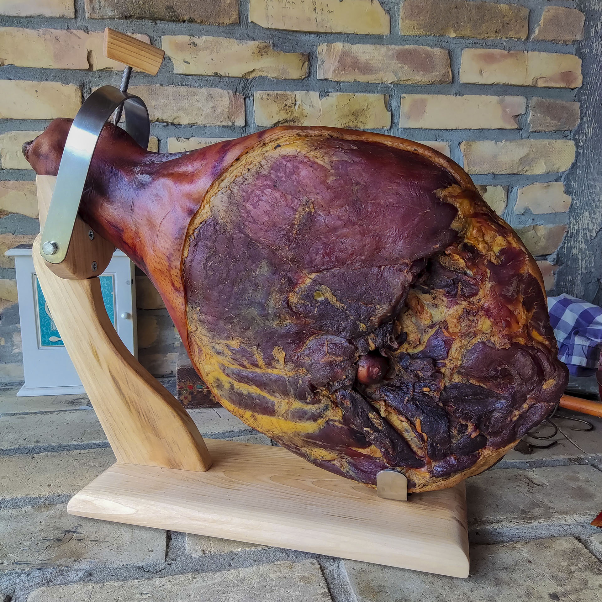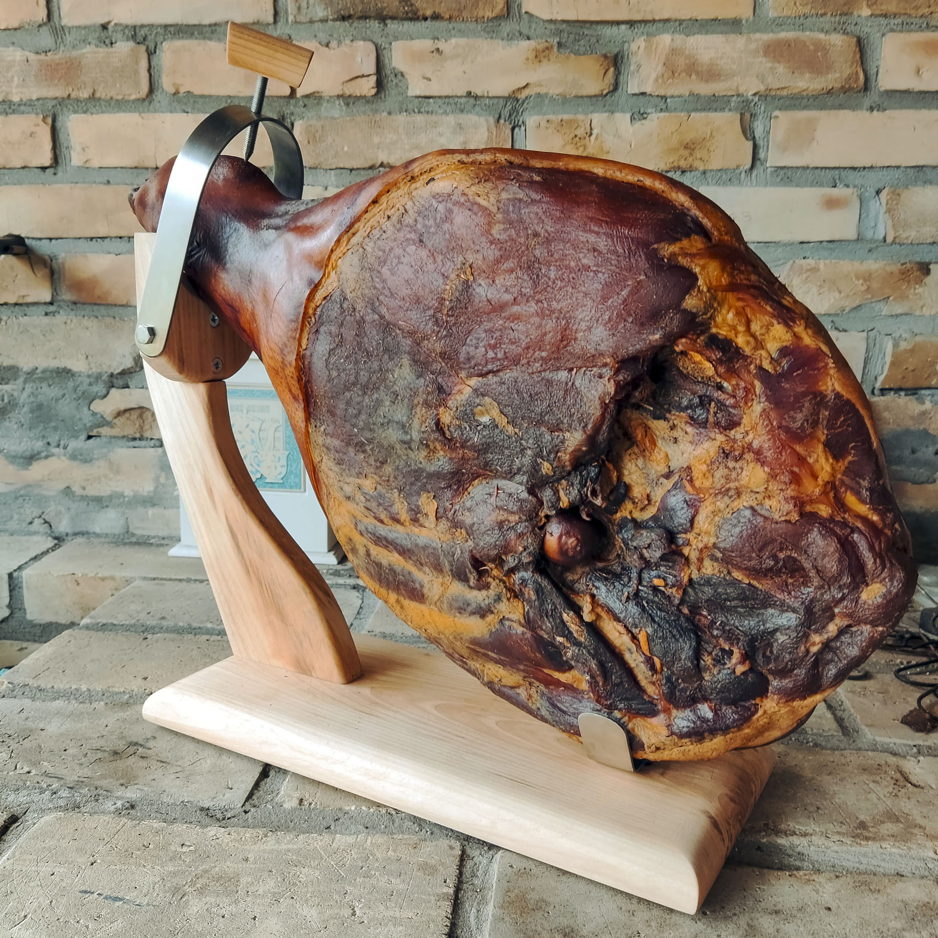 Stalak za šunku/pršutu izradjen od drveta lipe i inoxa (prohroma).